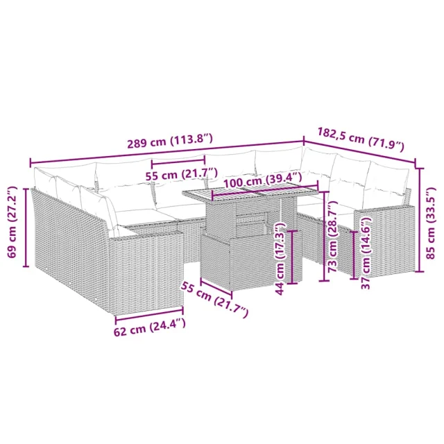 Ta vrtna sedežna garnitura je popoln dodatek za vaše dvorišče, teraso ali verando, saj zagotavlja udoben in vabljiv prostor za klepet z družino in prijatelji ali preprosto za sprostitev in uživanje na prostem.