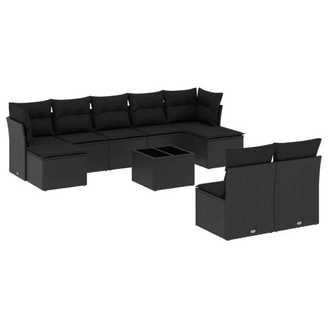 vidaXL Vrtna sedežna garnitura 10-delna z blazinami črn poli ratan