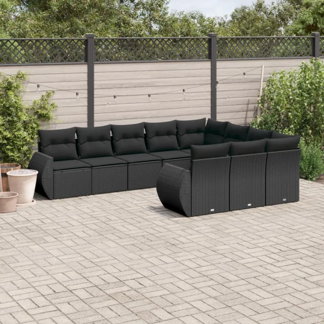 vidaXL Vrtna sedežna garnitura 10-delna z blazinami črn poli ratan
