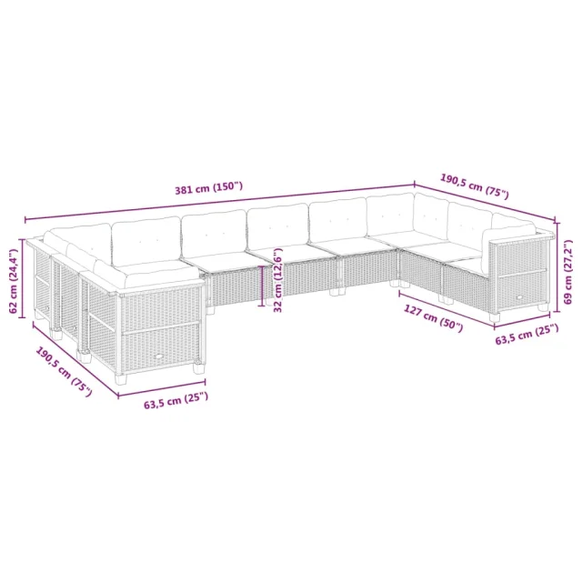 vidaXL Vrtna sedežna garnitura 10-delna z blazinami črn poli ratan