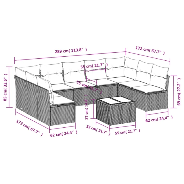 vidaXL Vrtna sedežna garnitura 10-delna z blazinami siv poli ratan