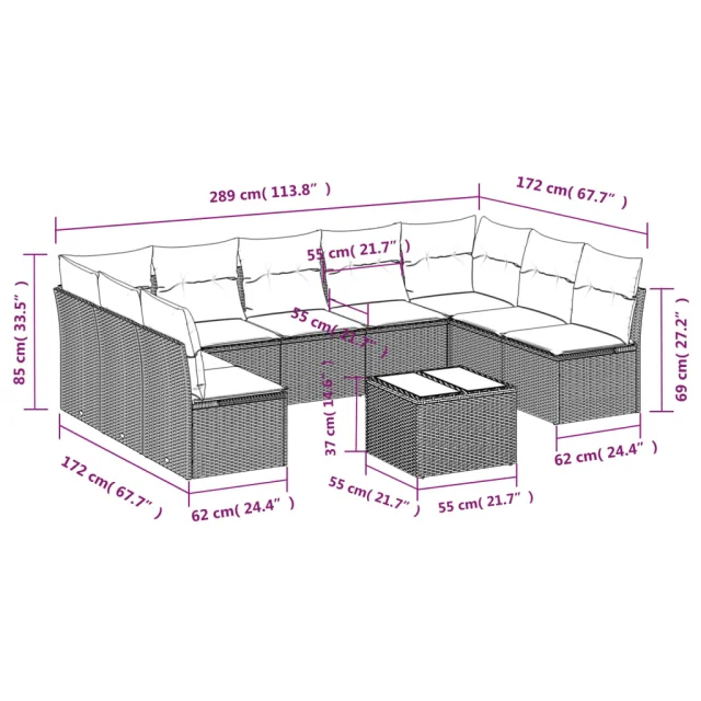 vidaXL Vrtna sedežna garnitura 10-delna z blazinami sv. siv poli ratan