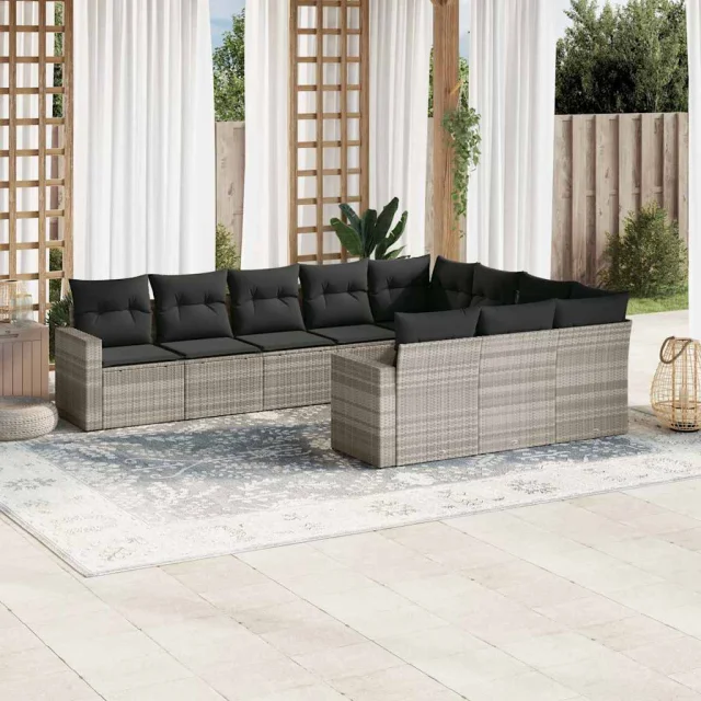 vidaXL Vrtna sedežna garnitura 10-delna z blazinami sv. siv poli ratan