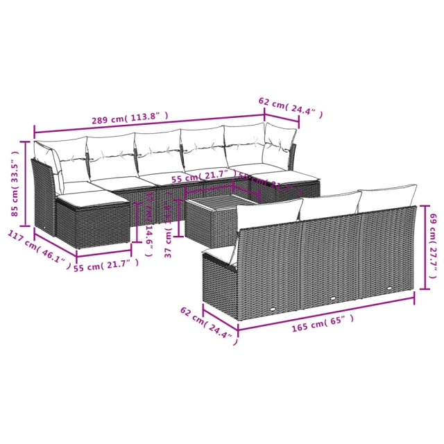 vidaXL Vrtna sedežna garnitura 11-delna z blazinami črn poli ratan