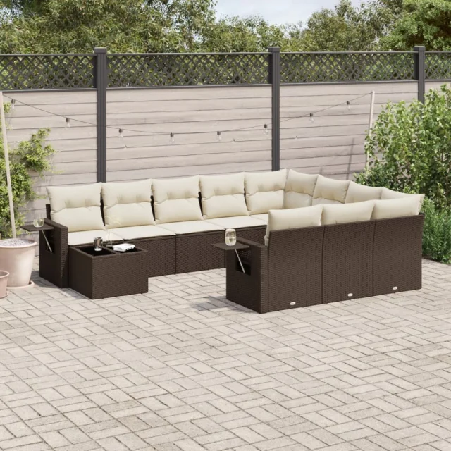 vidaXL Vrtna sedežna garnitura 11-delna z blazinami rjava poli ratan