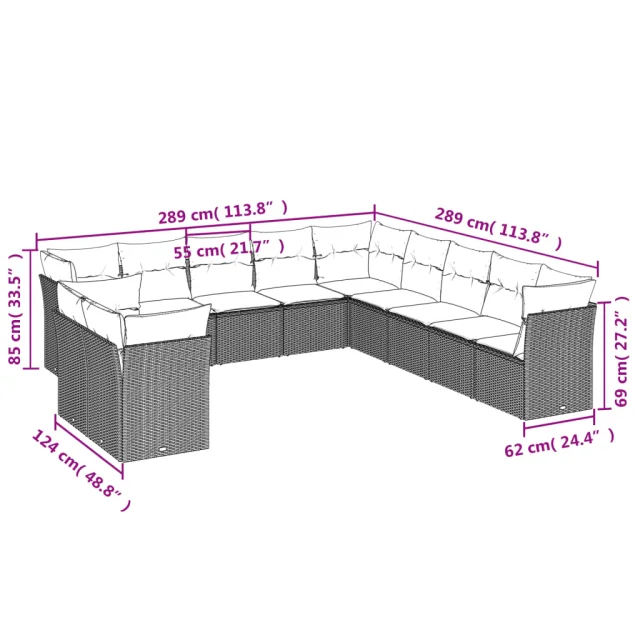 • Dimenzije kavča z 9 sedeži: 289 x 289 x 69 cm (Š x G x V)