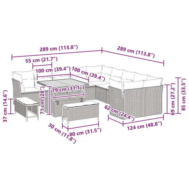 • Prilagodljivi modularni elementi Modularna zasnova omogoča, da se set prilagodi raznim priložnostim in postavitvam. Enostavno se preuredi za manjša družinska srečanja ali večje zabave, brez žrtvovanja udobja. Vsaka komponenta se lahko razširi ali premika po želji, kar izkoristi prostor.