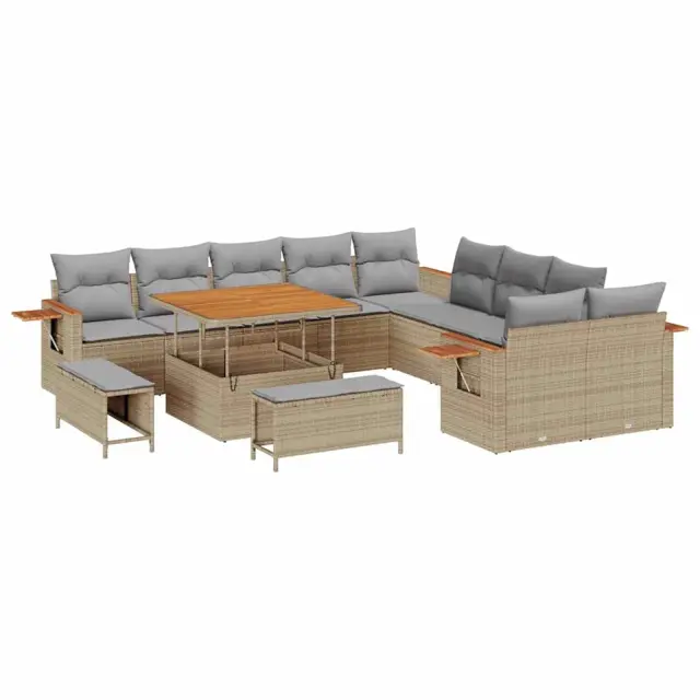 • Materiali: Modulni vrtni kavč je narejen iz vrhunskega poli ratana. Ta material je UV-odporen, kar pomeni, da bo ostal v dobrem stanju tudi na soncu. Dodatno je okrašen s trdim akacijevim lesom, ki je močan in vzdržljiv, kar vašemu pohištvu daje stabilnost.