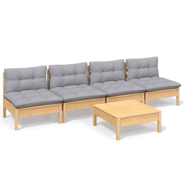 vidaXL Vrtna sedežna garnitura 5-delna s sivimi blazinami borovina
