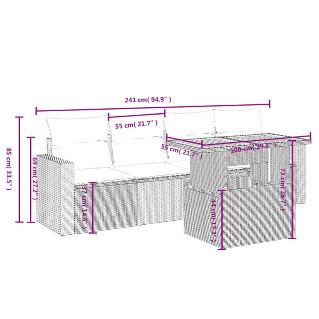Ta vrtna sedežna garnitura je popoln dodatek za vaše dvorišče, teraso ali verando, saj zagotavlja udoben in vabljiv prostor za klepet z družino in prijatelji ali preprosto za sprostitev in uživanje na prostem.