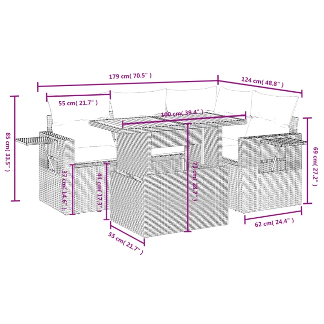 Ta vrtna sedežna garnitura je popoln dodatek za vaše dvorišče, teraso ali verando, saj zagotavlja udoben in vabljiv prostor za klepet z družino in prijatelji ali preprosto za sprostitev in uživanje na prostem.