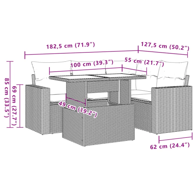 Ta vrtna sedežna garnitura je popoln dodatek za vaše dvorišče, teraso ali verando, saj zagotavlja udoben in vabljiv prostor za klepet z družino in prijatelji ali preprosto za sprostitev in uživanje na prostem.