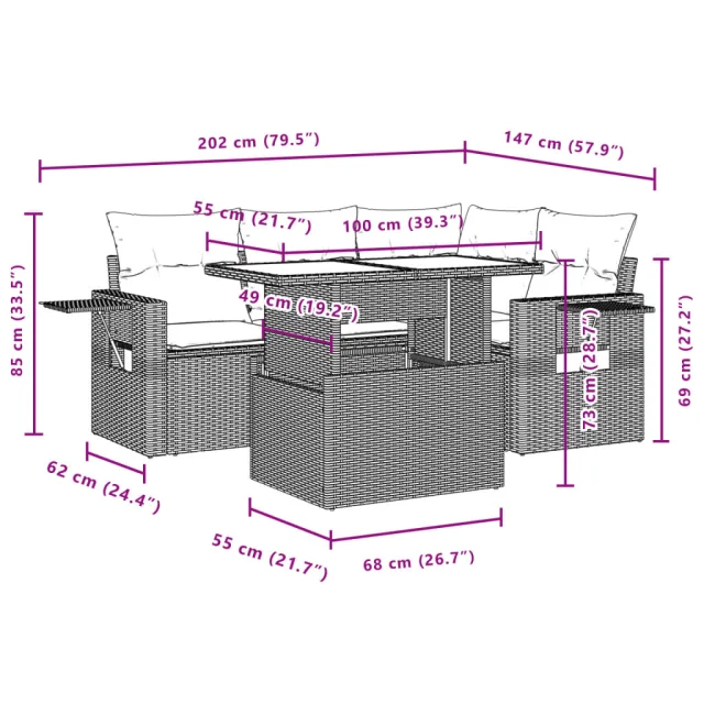 Ta vrtna sedežna garnitura je popoln dodatek za vaše dvorišče, teraso ali verando, saj zagotavlja udoben in vabljiv prostor za klepet z družino in prijatelji ali preprosto za sprostitev in uživanje na prostem.