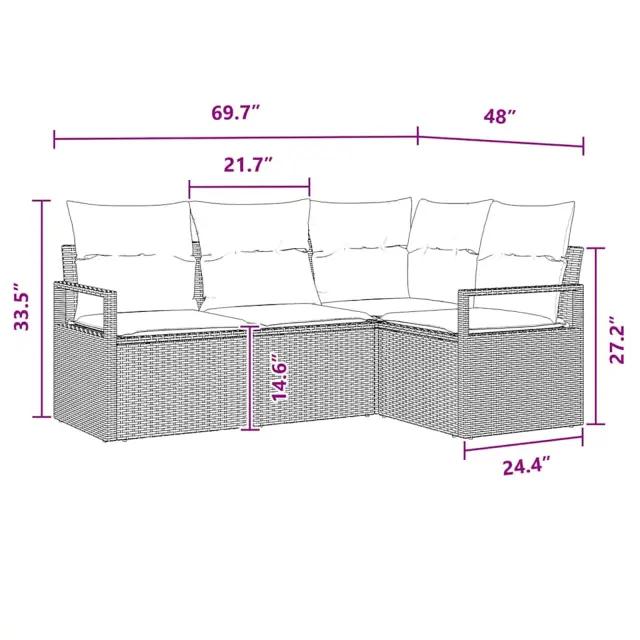 • Vključene komponente: Kavč komplet za vrt prihaja z mehkimi penastimi blazinami, ki imajo odstranljive prevleke iz poliestra, opremljene z zadrgami za enostavno pranje. Ponuja tudi poliratan naslon za roke in eleganten naslon za večje udobje.