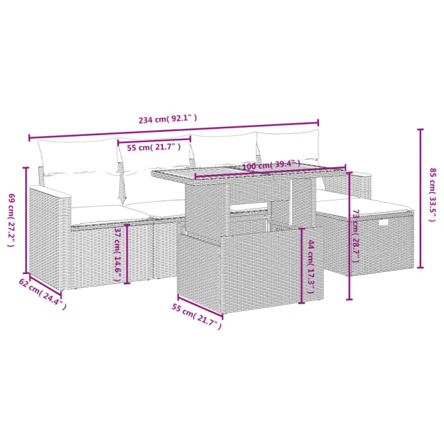 Ta vrtna sedežna garnitura je popoln dodatek za vaše dvorišče, teraso ali verando, saj zagotavlja udoben in vabljiv prostor za klepet z družino in prijatelji ali preprosto za sprostitev in uživanje na prostem.