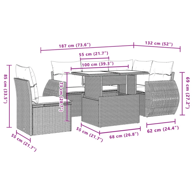 Ta vrtna sedežna garnitura je popoln dodatek za vaše dvorišče, teraso ali verando, saj zagotavlja udoben in vabljiv prostor za klepet z družino in prijatelji ali preprosto za sprostitev in uživanje na prostem.