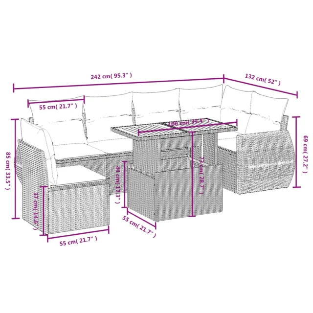 Ta vrtna sedežna garnitura je popoln dodatek za vaše dvorišče, teraso ali verando, saj zagotavlja udoben in vabljiv prostor za klepet z družino in prijatelji ali preprosto za sprostitev in uživanje na prostem.