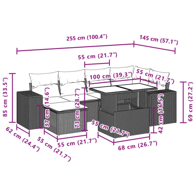 Ta vrtna sedežna garnitura je popoln dodatek za vaše dvorišče, teraso ali verando, saj zagotavlja udoben in vabljiv prostor za klepet z družino in prijatelji ali preprosto za sprostitev in uživanje na prostem.
