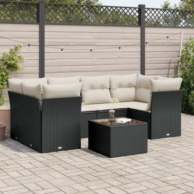 vidaXL Vrtna sedežna garnitura 7-delna z blazinami črn poli ratan
