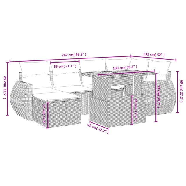 Ta vrtna sedežna garnitura je popoln dodatek za vaše dvorišče, teraso ali verando, saj zagotavlja udoben in vabljiv prostor za klepet z družino in prijatelji ali preprosto za sprostitev in uživanje na prostem.