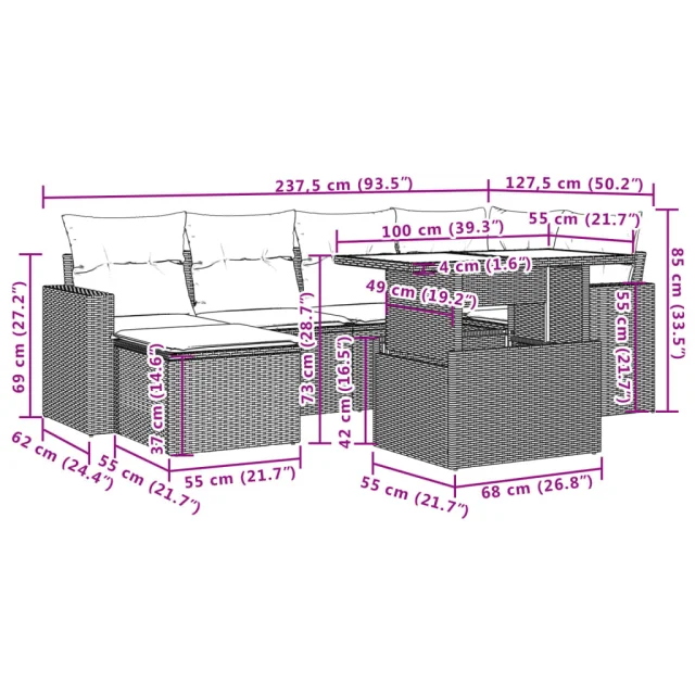 vidaXL Vrtna sedežna garnitura 7-delna z blazinami črn poli ratan