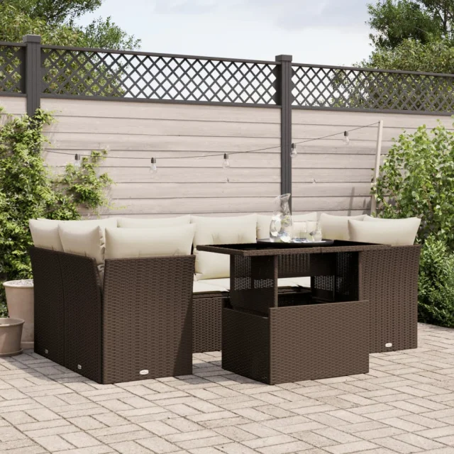 vidaXL Vrtna sedežna garnitura 7-delna z blazinami rjav poli ratan