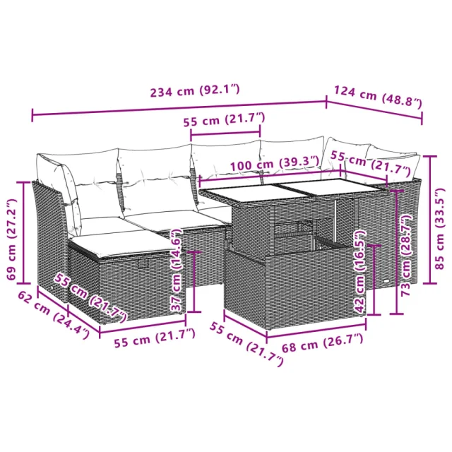 Ta vrtna sedežna garnitura je popoln dodatek za vaše dvorišče, teraso ali verando, saj zagotavlja udoben in vabljiv prostor za klepet z družino in prijatelji ali preprosto za sprostitev in uživanje na prostem.