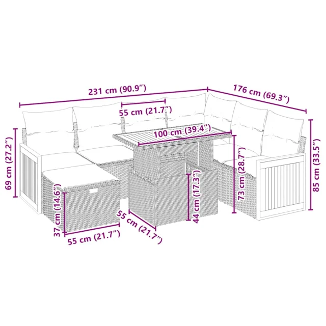 Ta vrtna sedežna garnitura je popoln dodatek za vaše dvorišče, teraso ali verando, saj zagotavlja udoben in vabljiv prostor za klepet z družino in prijatelji ali preprosto za sprostitev in uživanje na prostem.