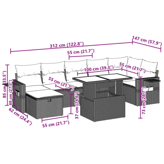 Ta vrtna sedežna garnitura je popoln dodatek za vaše dvorišče, teraso ali verando, saj zagotavlja udoben in vabljiv prostor za klepet z družino in prijatelji ali preprosto za sprostitev in uživanje na prostem.