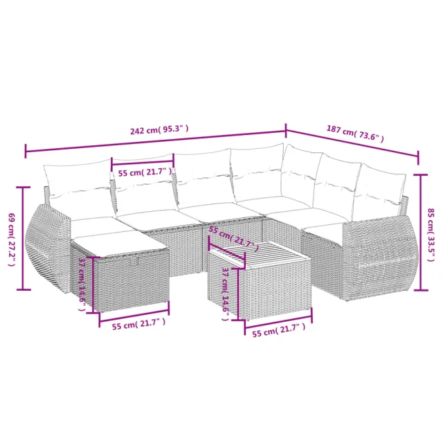 Ta vrtna sedežna garnitura je popoln dodatek za vaše dvorišče, teraso ali verando, saj zagotavlja udoben in vabljiv prostor za klepet z družino in prijatelji ali preprosto za sprostitev in uživanje na prostem.