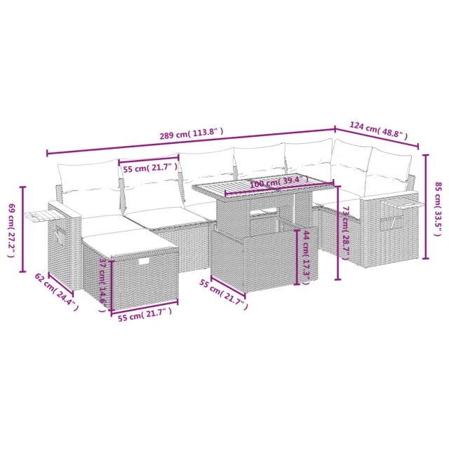vidaXL Vrtna sedežna garnitura 8-delna z blazinami črn poli ratan