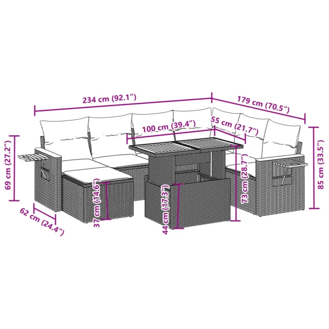 Ta vrtna sedežna garnitura je popoln dodatek za vaše dvorišče, teraso ali verando, saj zagotavlja udoben in vabljiv prostor za klepet z družino in prijatelji ali preprosto za sprostitev in uživanje na prostem.