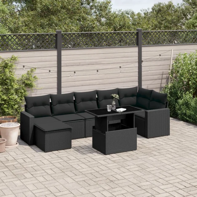 vidaXL Vrtna sedežna garnitura 8-delna z blazinami črn poli ratan