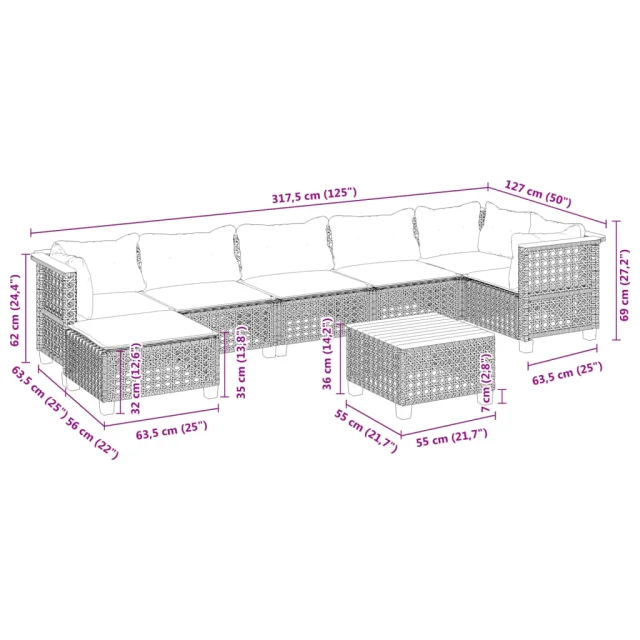 vidaXL Vrtna sedežna garnitura 8-delna z blazinami črn poli ratan