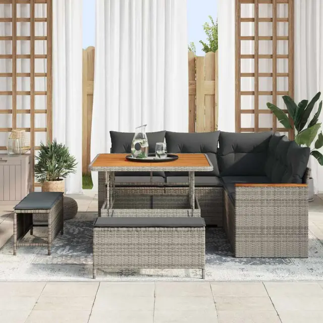 Ta garnitura je super kombinacija modernosti in praktičnosti, kar jo naredi idealno za vrtnice. Z čistimi linijami in manj okraskov se lepo vklaplja v terase in dvorišča ter dvigne izgled prostora. Modularna zasnova omogoča prilagoditev sedežev, bodisi za sproščeno druženje ali tihe večere. Robustni materiali zagotovijo dolgotrajnost, kar je pametna izbira za zunanji prostor.