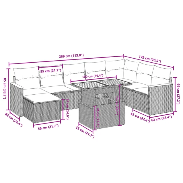 vidaXL Vrtna sedežna garnitura 9-delna z blazinami črn poli ratan