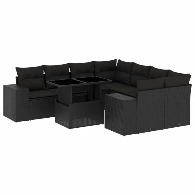 vidaXL Vrtna sedežna garnitura 9-delna z blazinami črn poli ratan
