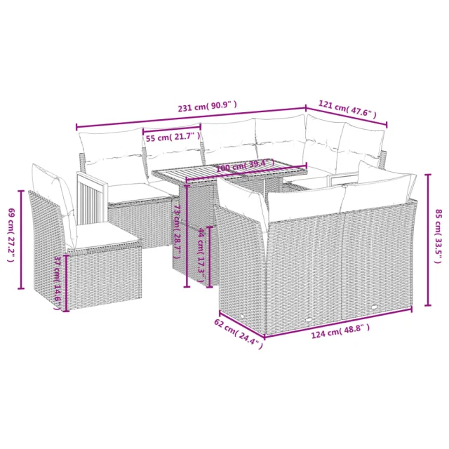 Ta vrtna sedežna garnitura je popoln dodatek za vaše dvorišče, teraso ali verando, saj zagotavlja udoben in vabljiv prostor za klepet z družino in prijatelji ali preprosto za sprostitev in uživanje na prostem.