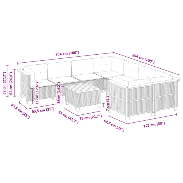 vidaXL Vrtna sedežna garnitura 9-delna z blazinami siv poli ratan