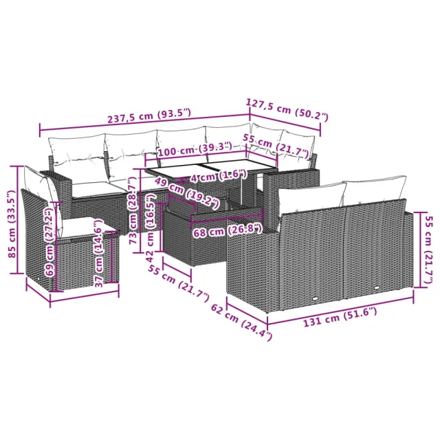 Ta vrtna sedežna garnitura je popoln dodatek za vaše dvorišče, teraso ali verando, saj zagotavlja udoben in vabljiv prostor za klepet z družino in prijatelji ali preprosto za sprostitev in uživanje na prostem.