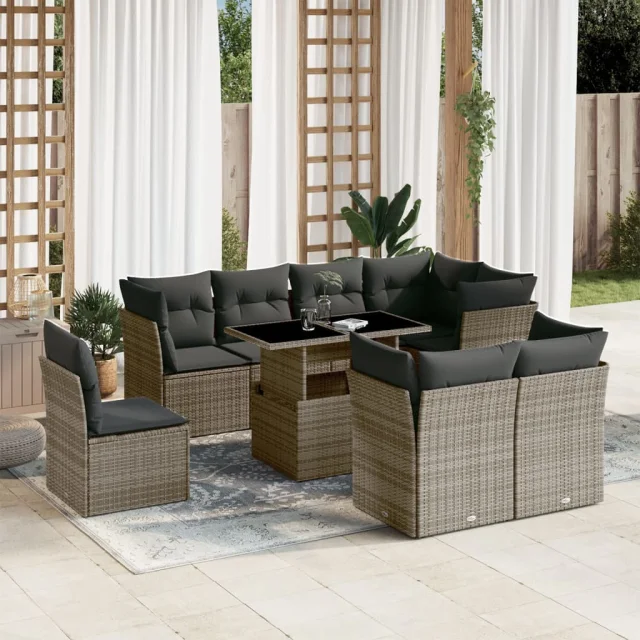 vidaXL Vrtna sedežna garnitura 9-delna z blazinami siv poli ratan