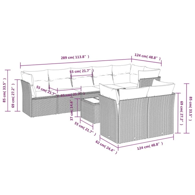 • Dimenzije kavča s 6 sedeži: 289 x 124 x 69 cm (Š x G x V)