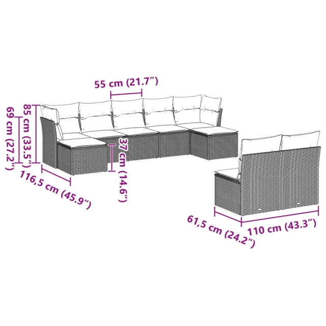 Ta vrtna sedežna garnitura je popoln dodatek za vaše dvorišče, teraso ali verando, saj zagotavlja udoben in vabljiv prostor za klepet z družino in prijatelji ali preprosto za sprostitev in uživanje na prostem.