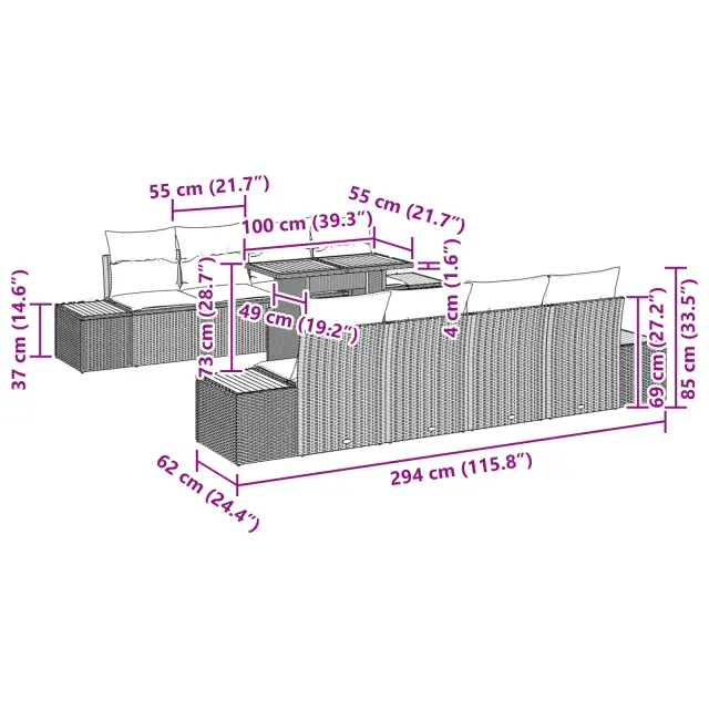 Ta vrtni kavč spremeni zunanjost v luksuzno zatočišče, kjer se srečata moderni stil in vsakodnevna uporabnost. Udobno gosti devet oseb, zato je odlična izbira za vsak patio, vrt ali teraso. Njegove čiste linije in preprost dizajn prinašajo sproščeno eleganco, ki se ujema s številnimi dekorativnimi slogi in ustvarja prijetno vzdušje za sproščena srečanja ali razkošne dogodke. Povišaj svoje zunanje večere s tem elegantnim pravokotnim setom, ki ima prijeten prepleten videz in vabi prijatelje ter družino, da se udobno namestijo.