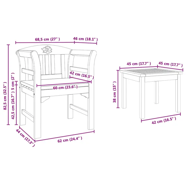 • 1 x Kava miza: 45 x 45 x 38 cm (D x Š x V)