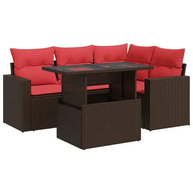 vidaXL Vrtna sedežna garnitura z blazinami 5-delna rjav ratan/akacija