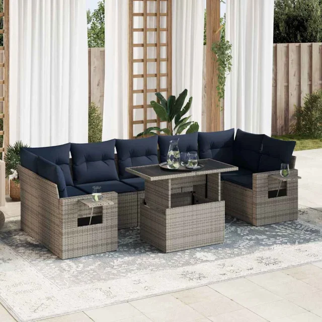 Ta vrtna sedežna garnitura je popoln dodatek za vaše dvorišče, teraso ali verando, saj zagotavlja udoben in vabljiv prostor za klepet z družino in prijatelji ali preprosto za sprostitev in uživanje na prostem.