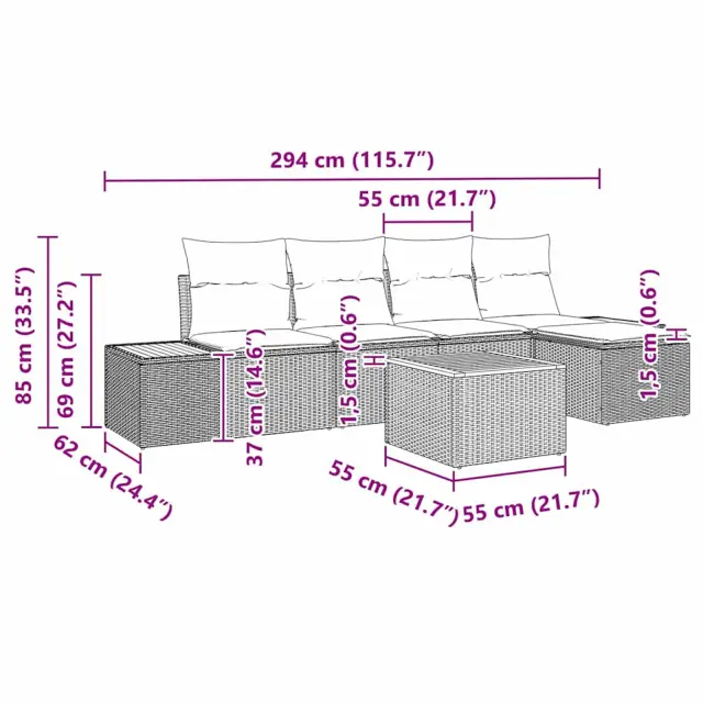 • Vključeni elementi: Set vključuje večnamensko vrtnarsko mizo, kavč s stranskimi mizicami, sredinske sedeže in footstool. Vsak del je zasnovan za udobje in funkcionalnost, s stilskim sedežnim podplatom in snemljivo blazino.