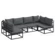 Ta vrtna sedežna garnitura je srce vašega zunanjega prostora, z čistimi linijami in minimalnim okrasjem. Zgrajena je iz trdnega aluminija in bledenju odporne tkanine, kar ji daje eleganten in hkrati robusten videz, idealen za terase in vrtove. Antracitna in črna barva dajeta sodoben izgled, ki obogati vsak zunanji prostor, zato je odlična izbira za družinska srečanja ali sproščanje. Uživajte v udobnem sedenju in trdni konstrukciji, ki je vredna malih in poletnih dni, ter združuje obliko z funkcionalnostjo.