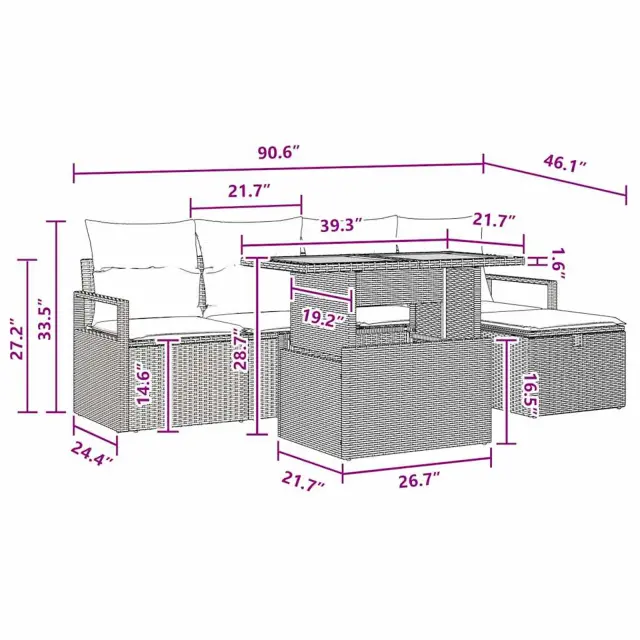 • Vrhnjski materiali: Ta eleganten set je narejen iz poli ratana in poliestra, ki brez težav preneseta sončne žarke in dež. Poli ratan je UV- in vodoodporen, kar je odlična izbira za zunanjo uporabo. Njegov prepleten videz dodaja naraven pridih, ki se ujema s sodobnim oblikovanjem.